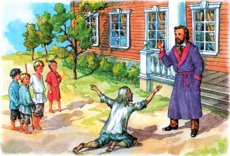 Но теперь он был совсем не страшен. Опять стал несчастным и жалким… И мальчишки, почувствовав эту жалость юродивого и увидев, что барину не до него, погнали несчастного к пруду. Они бежали и улюлюкали! И бедный юродивый свалился-таки в воду. Но тут же и вынырнул. В волосах его запутались какие-то водоросли. И стал юродивый похож уже не на самого себя, а на какого-то водяного.