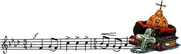 Колокол ударил еще и еще. И вслед за его мощным голосом поплыла какая-то, пока никому не известная музыка. Она плыла, смешиваясь с причитаниями юродивого, и от этого становилась причудливой, необычной. И еще почудилось композитору, будто поют грозную, но и забавную народную песню два грубоватых монаха — рыжий да лысый. А за песней несется глуховатый гомон толпы: «Смерть царю Борису! Детоубийце смерть!»
