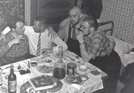 На 33-летии Зотикова (2-ой слева) в Антарктиде, 1959 (1-й слева профессор Б. А. Савельев, 3-й ? инженер транспортного отряда В. А. Панов)