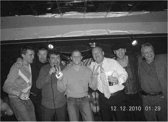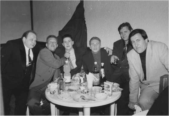 В НЕВЕ Олимпийский чемпион по вольной борьбе Хасан Бароев. Четвертый слева — автор, далее Глыба, Леня Ачкасов, Рюкзак. Рядом с Хасаном Бороевым — Яшка. Нева. Конец 90-х.