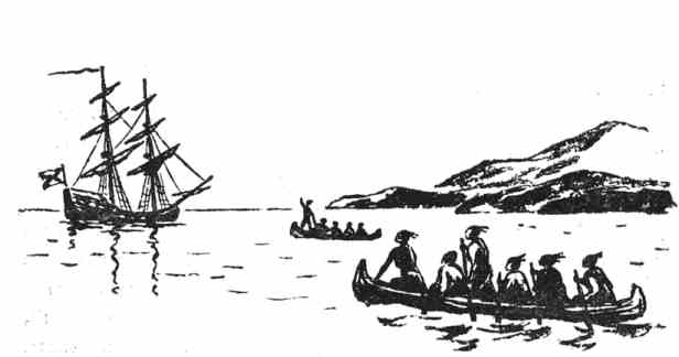 На следующий день после отправления Савельева со «Св. Павла» заметили две лодки, сначала принятые за свои. С одной из них, на довольно далеком расстоянии, люди кричали «агай, агай!» — но обе воротились. По-тлинкитски «агау» значит: «иди сюда».
