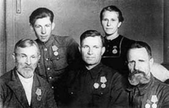 Группа партизан – в первом ряду (слева направо): В. Талаш, герой Советского Союза Р. Мачульский, Г. Гальченя; во втором ряду: М. Голиков, К. Гальченя
