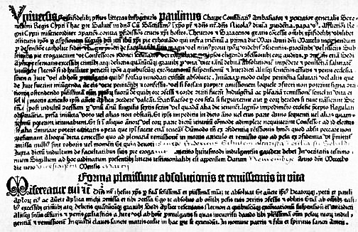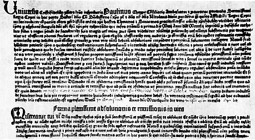 На первых порах, как и в старые времена, бланки для индульгенций размножали вручную. До наших дней дошло 20 воспроизведенных от руки и заполненных бланков. Старейшая известная нам дата заполнения — 4 января 1454 г.[303] Индульгенции пользовались успехом, бланков не хватало. Чтобы написать лишь один из них, искусный каллиграф-писец тратил целый рабочий день. Суммы, которые приходилось платить писцам, были велики; это существенно снижало доход от распространения индульгенций.
