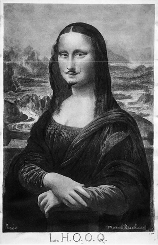 Марсель Дюшан, в том же году вернувшийся из Нью-Йорка в Париж, обогащает международное движение Дада своим «реди-мейд». Он компонует скульптуры из найденных фрагментов: прибора для сушки бутылок, велосипедной вилки, унитаза. В Париже он по случаю четырехсотой годовщины со дня смерти Леонардо да Винчи прикрепляет к стене репродукцию одной из самых признанных икон изобразительного искусства — Джоконды. Даме с загадочной улыбкой он пририсовывает усы и остроконечную бородку и тем самым высмеивает в стиле художественного вандализма не только канон в искусстве и святых этого канона, но и вдобавок приглашает поиграть в игру под названием «смена пола», совмещая женственность и мужественность. Преследуя аналогичные намерения, он присваивает себе псевдоним Эроз Селяви, намек на выражение «L’eros c’est la vie» («Эрос — это жизнь») и выдает себя за женщину. Бородатую Мону Лизу он называет L. H. O. O. Q, что является анаграммой фразы «Elle a chaud au cul» («У нее задница разгорячилась»). В одном интервью Дюшан сам толкует это название как «Там внизу огонь». Но Дада — это не только высмеивание традиций и догм, не только провокация по отношению к приличиям, обычаям и морали. Дадаисты пародируют также формы революционных движений своего времени; но в то же время в их бесцеремонности скрыт импульс освобождения. От чего они хотят освободиться — это дадаисты знают слишком хорошо. Но для чего они хотят освободиться — это понять сложнее: ради свободы художественного выражения? Свободы инстинктов и анархических сторон человеческой природы? Новое общество на таких основаниях вряд ли можно было бы создать, но отвоевание самоопределения и радости после долгих лет подавления индивидуума принудительной властью войны — это для дадаистов достойная цель.