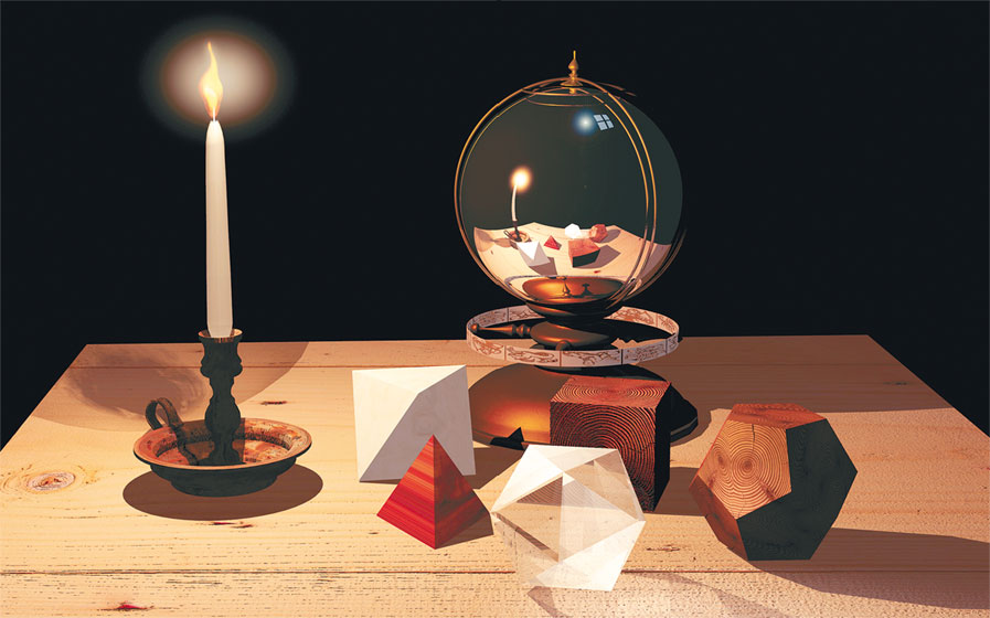 Пять платоновых тел, на которых, как считал Кеплер, зиждется Вселенная. Все они вписаны в сферу (как показано в отражающем хрустальном шаре).