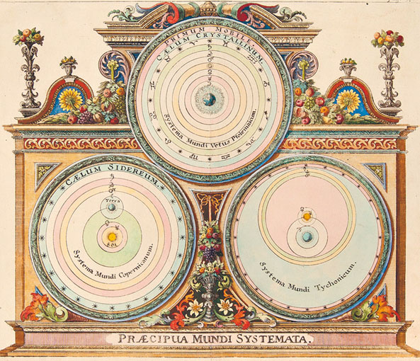 Модели Птолемея, Коперника и Тихо Браге применительно к благо-приятным и неблагоприятным для здоровья периодам, согласным с положением планет. Раскрашенная гравюра из книги «Чудесный мир» (Mundi mirabilis) Иоганна Зана, математика и изобретателя. 1696 год.
