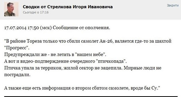 Не менее веским доказательством вины ВС ДНР являются и заявления самого тогдашнего министра обороны ДНР И. Стрелкова (Гиркина) в день катастрофы о только что сбитом украинском самолете АН-26 в районе Тореза. Место падения, указанное Стрелковым, полностью совпадает с местом падения Боинга, поэтому неудивительно, что уже вечером того же дня данное сообщение было удалено.