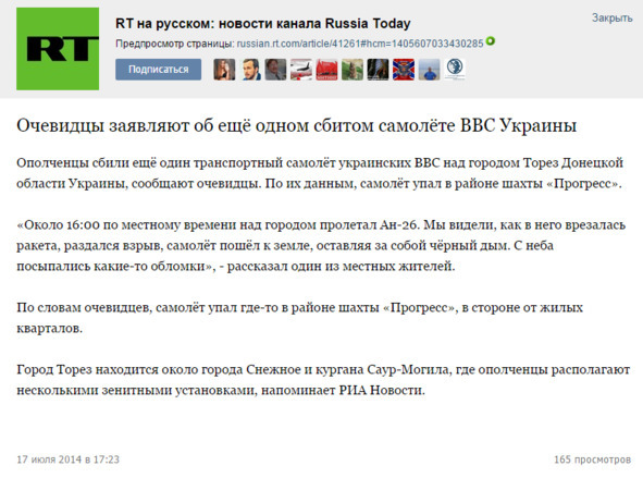 Сообщение Стрелкова о сбитом АН-26 сразу же подхватили многие российские СМИ.