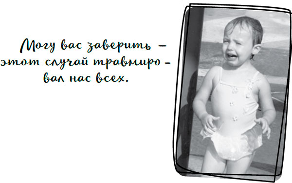 Возьмем, к примеру, первое посещение бассейна с ребенком. Вы всячески стараетесь выглядеть клево перед своей худой соседкой без детей, которая, скорее всего, ночью поспала больше двух часов, и вдруг замечаете, что задницу вашего ребенка начинает раздувать. Тут вы с ужасом понимаете, что ваш муж надел на ребенка не специальный подгузник для плавания, а обычный, и теперь он впитывает воду из бассейна и набухает, как ядерный гриб, а ваш ребенок смотрит на вас типа такой: «Что за хрень происходит с моей одеждой?», и тогда вы такая вся: «БЕЗ ПАНИКИ. Медленно иди в сторону туалета», но ребенок такой весь: «Возьми меня на руки! МЕНЯ ХОЧЕТ СОЖРАТЬ МОЙ СОБСТВЕННЫЙ ПОДГУЗНИК», и вы берете его на руки, и в этот момент под давлением швы подгузника расходятся, и по вам растекается этот гель, который кладут в подгузники, – он, оказывается, представляет собой голубоватое, кристаллообразное желе. Вам одновременно и противно, и любопытно, и вы несетесь в туалет, но желе капает, и за вами остается след, а спасатель в бассейне смотрит на вас презрительным взглядом; вы между тем наконец добираетесь до туалета, а гель внутри подгузника продолжает набухать. Так что, как только вы стягиваете с ребенка купальный костюм, подгузник разрывается на части, плюхается на пол, и синее желе разбрызгивается повсюду. И именно в этот момент в туалет беззаботно заходит ваша бездетная соседка и тут же в шоке прижимается к стене, увидев вас, согнувшуюся посередине туалета, покрытую синим наполнителем подгузника и отчаянно пытающуюся убрать бесполезными бумажными полотенцами это (скорее всего, канцерогенное) желе со своего ребенка. А вы стараетесь улыбаться ей ободряющей улыбкой, как будто подобная хрень происходит с вами постоянно, и как раз собираетесь встать и как бы между делом объяснить, что на самом деле во всем виноват ваш муж, как вдруг ваш ребенок замечает вашу огромную грудь, угрожающе нависшую над краем купальника, и бьет по ней, и она от этого вываливается наружу. И соседка молча пятится прочь из туалета, как будто увидела чей-то труп, а вы кричите ей вслед: «ТЕБЕ ОТ МЕНЯ НЕ УБЕЖАТЬ. УЗРИ. ЭТО. ТВОЕ. БУДУЩЕЕ!»
