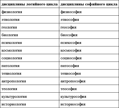 Софийные дисциплины не являются частью философии, поскольку более конкретно и систематически изучают свой предмет, разрабатывают специальную систему понятий. В этом смысле следует делать различие между философией природы, которую можно найти у Гегеля, и биософией или геософией, которой занимались такие ученые, как Э. Геккель или В. Вернадский. Софийные дисциплины образуют как бы зону перехода от обобщающих принципов философии к эмпирическим методам «логийных» дисциплин.
