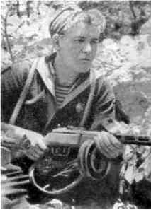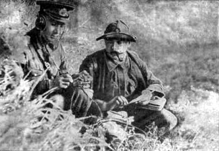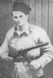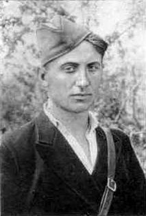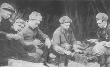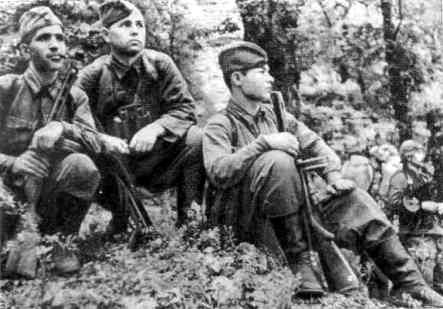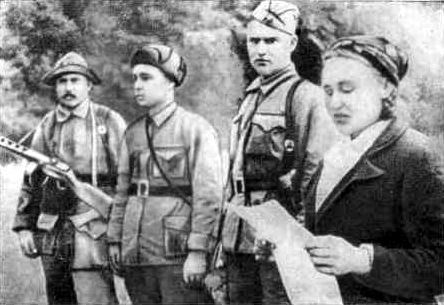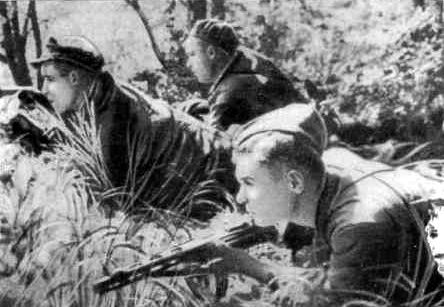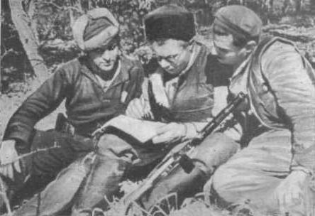 В партизанском лесу. Слева направо: Николай Овдиенко, секретарь Крымского обкома комсомола; Григорий Саркисьян, начальник штаба ЦОГ; Иван Запорожский, кинооператор; Мирон Егоров, комиссар 5-ой бригады; Петр Ямпольский, секретарь Крымского подпольного обкома, начальник ЦОГ; Николай Луговой, начальник политотдела.
