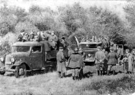 Партизаны группы Ивана Семашко (на передней машине) и группы Юрая Жака (на двух «татрах») отправляются на боевую операцию. 4 ноября 1943 г.