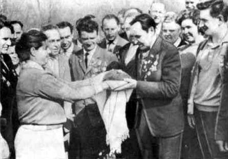 В «зале» партизанского суда: М. Егоров, Н. Луговой, Ф. Федоренко