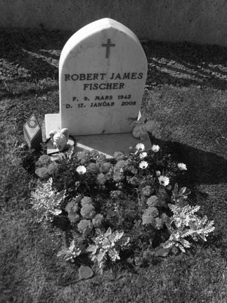 Отец Якоб Ролланд, миниатюрный католический священник, выходец из Франции, которому выпала уже честь участвовать в похоронах Халлдора Лакснесса (единственный исландский нобелевский лауреат — в области литературы — и обращенный в католицизм) произнес несколько слов благословения, проведя, как сообщают, параллель между похоронами Бобби и Моцарта, прежде чем гроб опустили в могилу. «Как и того — хоронят в присутствии немногих, и он обладал таким же, как и тот, умом, способным видеть то, что другие еще даже не начали понимать». Не было ни панихиды, ни фимиама, ни реквиема. Даже звезды, обычно хорошо видимые на незагрязненном небе, спрятались за дождевыми облаками в эту мрачную ночь. Церемония заняла двадцать минут, после чего ее продрогшие участники покинули кладбище. На могильном холме торопливо поставили белый деревянный крест с табличкой, на которой было написано: