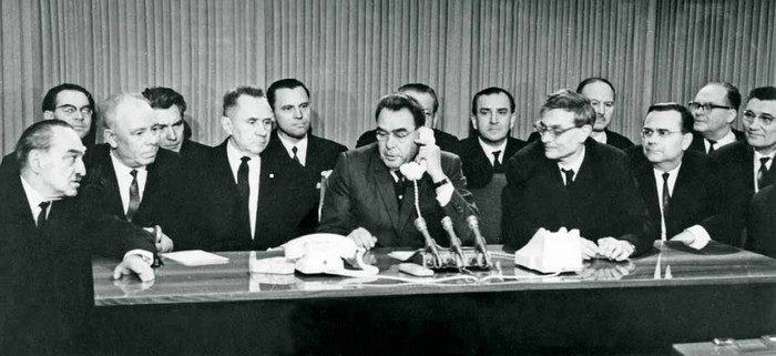 Брежнев разговаривает по телефону с членами экипажа космического корабля «Восход 2» П. И. Беляевым и А. А. Леоновым. Москва 18 марта 1965 г.