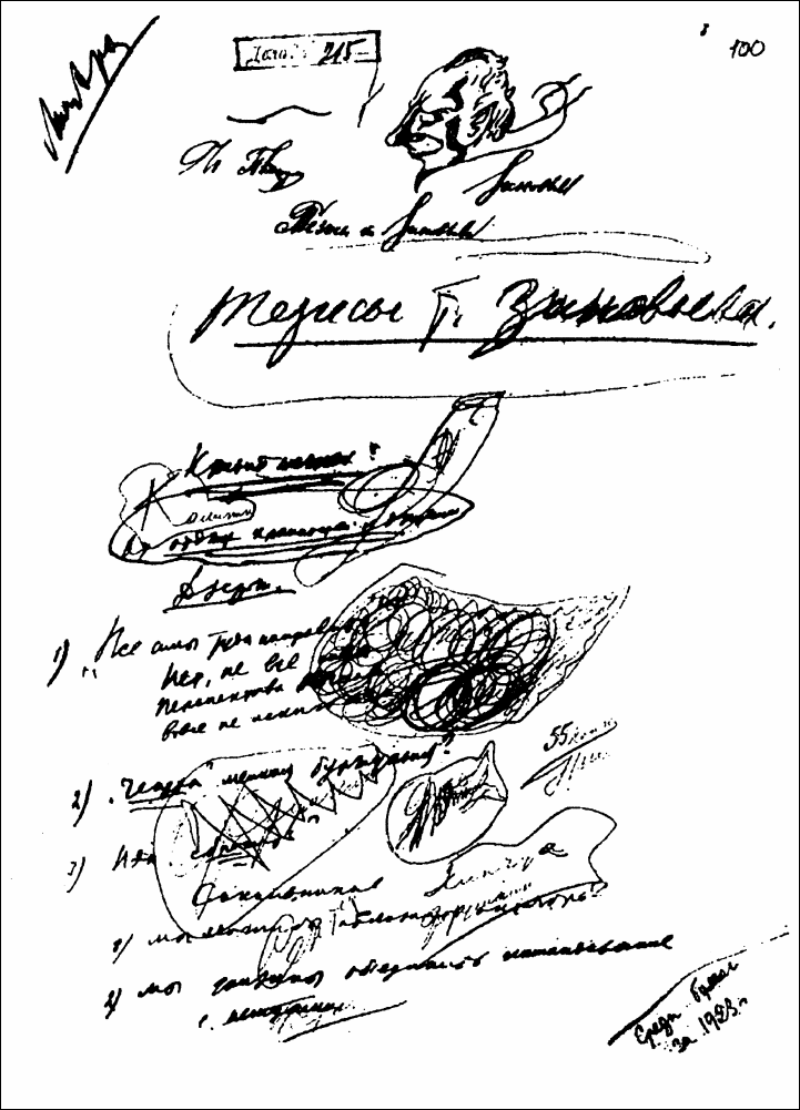 На одном из листков, обнаруженных мной в архиве Сталина, наверху есть пометы: «Личный архив. Дело 215», а внизу: «Среди бумаг за 1923 г.»[91]. Это год, когда Ленин был еще жив, но временами уже почти невменяем. Против Троцкого сплотились все члены Политбюро, и каждый думал, что он если и не вожак правящей стаи, то, по крайней мере, ровня остальным. Сталин уже тогда начинает думать иначе, но пока ни малейшим движением не выдает себя. В лидеры рвется Григорий Зиновьев. Впервые после Ленина именно он должен сделать основной политический доклад на XII съезде партии, который соберется в апреле 1923 года. Значит, все происходит накануне, на заседании Политбюро, на котором предварительно обсуждаются и согласовываются, как дважды записал перьевой ручкой на листке Сталин: «Тезисы т. Зиновьева». Пока Зиновьев докладывает, Сталин быстрыми, точными штрихами, тонким пером, коричневатыми железистыми чернилами набрасывает портрет. Потом, уже не спеша, тем же пером помечает основные соображения выступавших по поводу тезисов: Калинина, Дзержинского, Сокольникова, Хинчука. Одновременно, по давно устоявшейся привычке, машинально чертит обводы, «скрипичные ключи», какие-то цифры и любимый росчерк-метку «Тиф…». А профиль головы «Зиновьева», оставляя за собой завихрения, стремительно рвется от верхней кромки листа вниз, парит с устремленным вперед носом и бородкой, с еще более ускоряющей парение залысиной и дьявольски заостренными резко назад, к затылку, «свинячьими» ушами. В полете завораживает следящего за ним своим большим, хитроумно-злым, внимательнейшим глазом. Скупой и точный по подлинному сталинскому чувству портрет. Это образ, «гештальт» опаснейшего врага – «двурушника». Между 1923 и 1936 годами, то есть тем последним годом, в котором Зиновьев будет казнен, пройдет целых тринадцать лет, но такое впечатление, что казнь предрешена, хотя сам Сталин, возможно, еще не осознает этого.