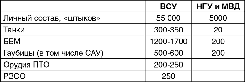 Что касается нацгвардии, то суммарно «армия» МВД в зоне АТО (без патрульных, следователей и МЧС) в боевых подразделениях насчитывает до 6 механизированных батальонов, 6 мотопехотных батальонов, до 2 танковых рот (неполного состава), до 6 дивизионов артиллерии. Численность: 5 000 человек ЛС, до 20 танков, до 200 ББМ, до 100 орудий.[213]