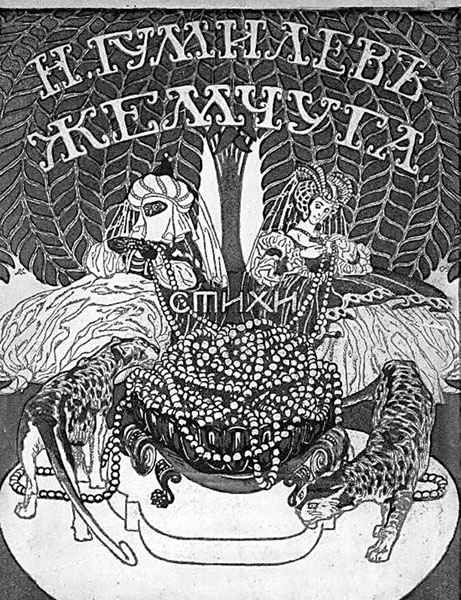 Обложка книги стихов «Жемчуга» (1910, художник Д.Н. Кардовский), посвященной «Моему учителю Валерию Брюсову»