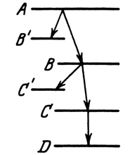 Квантовый скачок (переход) вниз с одного энергетического уровня на другой сопровождается излучением фотона; поглощение фотона приводит к скачку на верхний уровень (согласно постулатам Бора). На подобных диаграммах фотоны не отображались вовсе, как и на других, еще более неудачных схемах того же процесса[128].