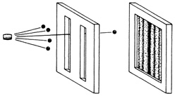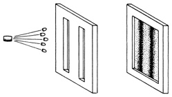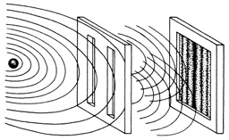 Фейнман описал то, с чем его читатели уже были знакомы, — канонический эксперимент квантовой механики, так называемый эксперимент с двумя щелями, который для Нильса Бора стал иллюстрацией неизбежного парадокса корпускулярно-волнового дуализма. К примеру, поток электронов проходит сквозь две прорези в экране. С противоположной стороны их поступление фиксирует детектор. Достаточно чувствительный прибор способен фиксировать перемещения электронов в виде полета множества пуль; он может быть настроен так, чтобы производить щелчки, подобно счетчику Гейгера. Однако возникающая картина демонстрирует другое пространственное явление: вероятность найти электрон в той или иной точке детектора определяется дифракционной картиной, а точнее — результатом интерференции «электронных» волн, прошедших через щели. Так что же такое электрон — частица или волна? Решением этого парадокса в квантовой механике стал неизбежный вывод: каждый электрон каким-то образом «видит» обе прорези и проходит через них одновременно. В классическом же представлении частица должна проходить только через одну из двух щелей. Однако в процессе эксперимента, когда прорези поочередно закрывали, пропуская поток электронов сначала через щель А, а затем через щель В, интерференции не происходило. Делались попытки «поймать» частицу в момент ее прохождения через одну из щелей, разместив детектор рядом с прорезью, но, казалось, само присутствие детектора разрушало возникавший ранее рисунок.