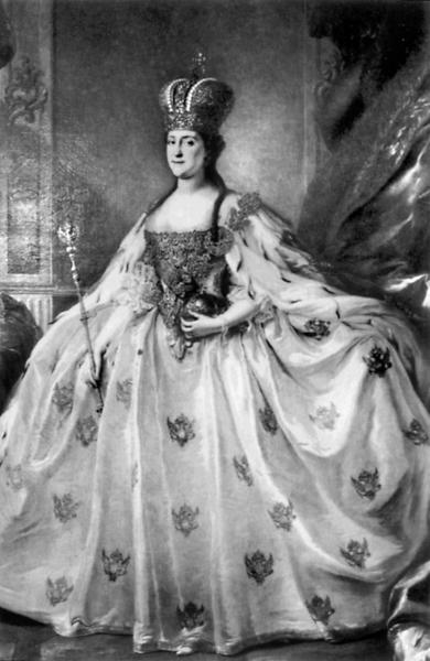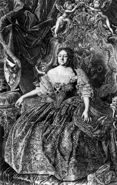 Императрица Анна Иоанновна в день коронации (1730). По гравюре, отпечатанной в Москве.