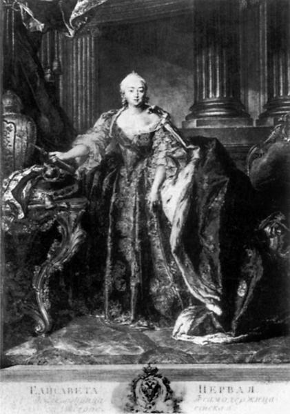 Елизавета Петровна, императрица России (1741–1762). Это дочь Петра I Великого. «Портрет». Гравюра на меди, 1761 года, Георга-Фридриха Шмидта (1696–1772), выполненная по живописному портрету работы Луи Токе (1696–1772), написанному в 1758 году.