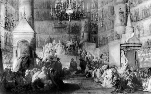 Внизу: Екатерина II Великая, императрица России (1729–1796). «Коронация Екатерины II». Живопись Стефано Торелли, выполненная в 1777 году. Масло на холсте. Москва. АКG-Фото.