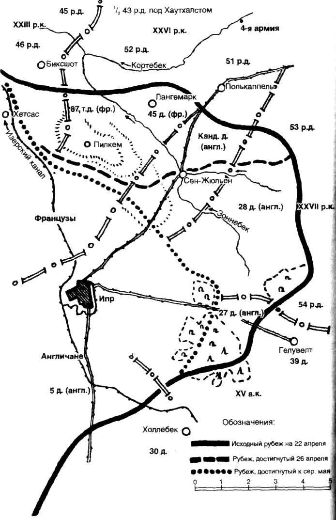 К вечеру немцы продвинулись на участке шириной одиннадцать километров на максимальную глубину два километра и больше. Между каналом Изер и Сен-Жюльеном открылась брешь шириной примерно три с половиной километра. К сожалению, единственной силой, имеющейся в распоряжении 42-й армии для закрепления этого блестящего успеха, была половина 43-й резервной дивизии, которая стояла под Хаутхалстом, но была слишком рассредоточена и слишком слаба для того, чтобы ухватиться за эту благоприятную возможность, пока таковая еще существовала. В последующие дни немцы еще увеличили первоначальный результат при помощи повторных газовых атак, и англичане в конце концов были вынуждены оставить значительную часть Ипрского выступа. 9 мая, к тому времени как сражение закончилось, территориальный выигрыш немцев составлял участок земли примерно шестнадцать километров в ширину при максимальной глубине более пяти километров. Противники справились со своей первоначальной паникой и очень скоро сообразили, как до некоторой степени защитить себя с помощью импровизированных масок. Теперь сами немцы стали нести тяжелые потери.