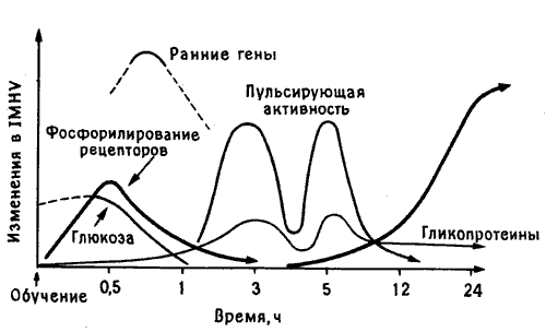 Рис. 10.3. Молекулярный каскад памяти. Кривые схематически показывают последовательность молекулярных изменений, наблюдаемых в IMHV цыпленка в разные сроки после опыта с горькой бусиной.