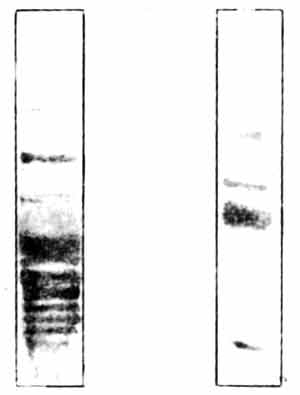 Пре- и постсинаптические мембраны можно выделить из IMHV методом центрифугирования, примерно так, как описано в главе 3, и исследовать их в чистом виде. Разумеется, они содержат и белки, и фосфорилирующий их фермент протеинкиназу С. Если к ничтожному количеству мембранного материала добавить радиоактивный АТФ и несколько минут инкубировать полученную смесь в крошечной пробирке, мембранные белки окажутся мечеными и фосфорилированными. Другой простой, но остроумный метод позволяет выделить отдельные белки и измерить количество радиоактивной метки в каждом из них. В этом методе используются различия в молекулярном весе и электрических свойствах между сотнями присутствующих в мембранах белков, каждый из которых несет на себе специфический набор положительных и отрицательных зарядов. Для того чтобы разделить такие белки, берут небольшую прямоугольную полоску из студенистого инертного материала — крахмального или акриламидного геля, наносят на один ее конец каплю раствора с белковой смесью и пропускают через гель электрический ток. Белки перемещаются под действием тока с разной скоростью, зависящей от их молекулярного веса и электрического заряда, и через несколько часов распределяются по всей длине полоски. Эта процедура называется, гель-электрофорезом. Гель пропитывают красителем, который окрашивает белки, и они становятся видны на бесцветном фоне геля как последовательность синих полос, похожих на линии, проведенные чернилами. Участки геля, содержащие разные белки, вырезают бритвенным лезвием и определяют их радиоактивность, или же весь гель накладывают на рентгеновскую пленку и получают радиоавтограф, точно так же как в опытах с 2-дГ[31].