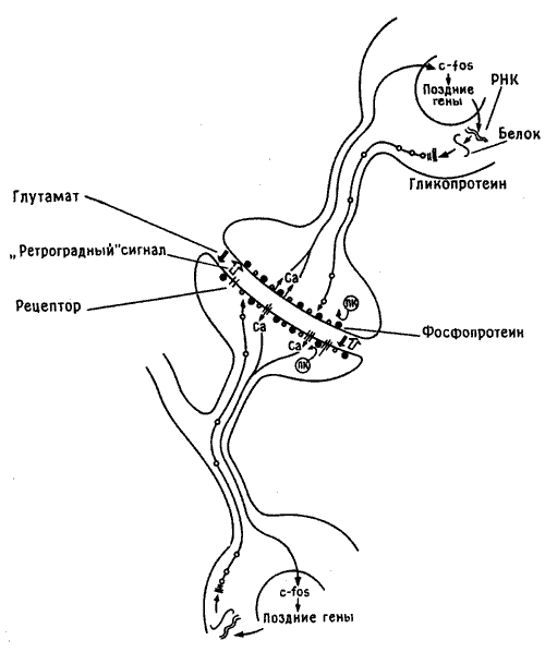 Биосинтез белков определяется информацией, заключенной в ДНК, т. е. в генах клеточного ядра. Для образования новых белков необходимо, чтобы активировалась ДНК и нужные гены включились в работу. Поэтому изменение фосфорилирования синаптической мембраны, по-видимому приводящее к поступлению в клетку кальция, должно служить своего рода сигналом для ядерной ДНК. Сейчас мы не знаем всех деталей работы этого механизма, но к концу восьмидесятых годов стало ясно, что поступление такого сигнала в ядро активирует группу «генов раннего действия». Этот феномен впервые наблюдали в быстро делящихся раковых клетках, но вскоре была показана его универсальная природа. «Ранние» гены обеспечивают активацию других («поздних») генов и выработку в клеточном ядре инструкций для последующего синтеза ключевых структурных белков — тех, что в конце концов включаются в состав синаптической мембраны, изменяя ее строение. Структурные белки кодируются поздними генами, тогда как ранние гены ответственны лишь за образование группы промежуточных сигнальных пептидов, получивших такие варварские наименования, как c-fos и c-jun. Эти и другие подобные им пептиды воздействуют на ядерную ДНК, включая в работу надлежащие поздние гены. Этот сложный каскад сигналов схематически представлен на рис. 10.5.