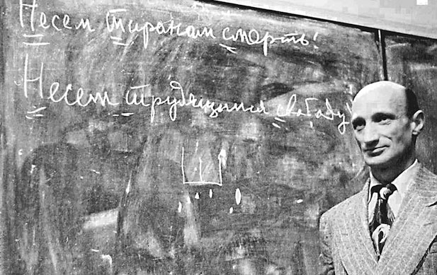 В 1951 году Шульгины переехали в Вашингтон, где, как уже было сказано, Дима преподавал русский язык, но еще не слепым, а в 1955 – в Филадельфию. Вот его фотография перед доской, на которой он написал «Несем тиранам смерть! Несем трудящимся свободу!» – лозунг НТС. Подчеркнутые начальные буквы каждого слова, по всей вероятности, выказывают то, что он студентам в Джорджтаунском университете объяснял, каким образом НТС проникал в Советский Союз, а именно этими фразами, в которых была зашифрована его аббревиатура.