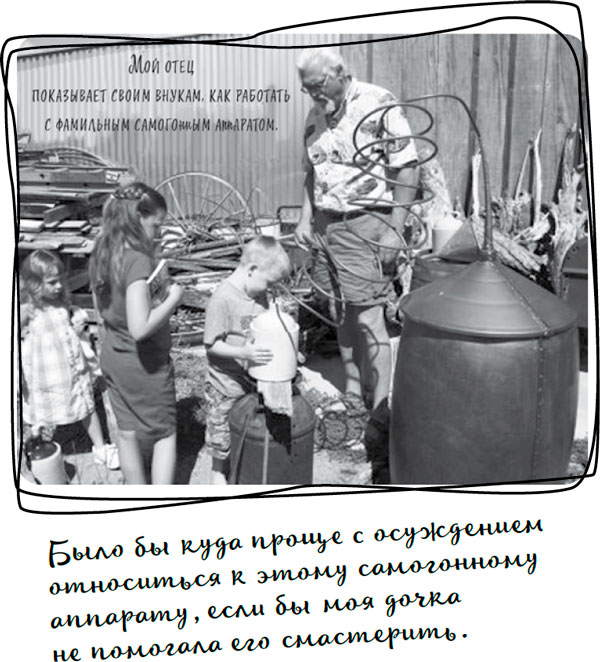 Хейли, когда мы приезжали в гости к моим родителям, всегда играла с самогонным аппаратом. Еще она каталась во дворе верхом на миниатюрном ослике по кличке Джаспер. А вместе со своими двоюродными братьями и сестрами она забиралась на старые тракторы и древние почтовые кареты и разбрасывала за домом всякий мусор. Дети играли и со смехом изучали чучельную мастерскую моего отца и надевали вместо масок коровьи черепа. Они искали клады по старинным картам, «найденным» моим отцом, и откапывали набитые монетами, всякой бижутерией и наконечниками для стрел деревянные сундуки, которые специально для них закапывал отец. Они бродили по участку, гоняли коз и веселились от души, так что мы с Лизой не могли не согласиться с тем, что их радость стоит того, чтобы время от времени в ее или мою комнату посреди ночи приходили заплутавшие утята.