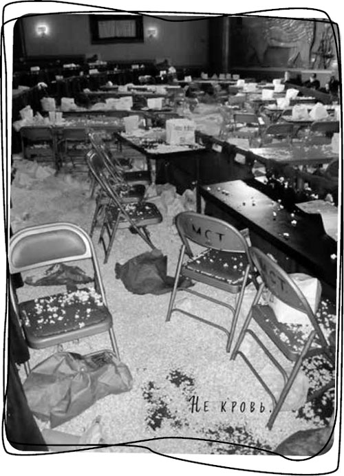 Когда представление подошло к концу, я посмотрела на пол и увидела там кровавые подтеки, и это меня несколько встревожило, потому что Виктор угрожал положить в свой попкорн камни, чтобы разобраться с передним рядом. К счастью, оказалось, что это просто красный ковер, который местами проглядывает из-под гор попкорна.