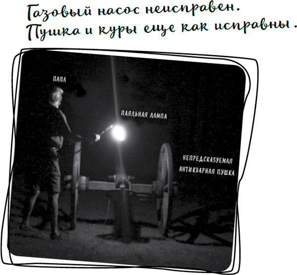 – Уверен, что это безопасно? – спросила Лиза, и папа заверил ее, что разрешит Тексу только зарядить и подготовить пушку – для этого Тексу нужно было стоять прямо перед огромной заряженной пушкой – но сестра сохраняла относительное спокойствие, потому что знала, что папе в любом случае вряд ли удастся пушку зажечь. И она оказалась права. Но папа решил, что нужно просто больше пламени, и принялся зажигать непокорную пушку паяльной лампой. Тогда-то я и побежала за фотоаппаратом, потому что знала, что мне в жизни никто не поверит. Залп пушки в столь поздний час непременно разбудил бы соседей, но тут я вспомнила, что они запускали салют всю неделю напролет, так что, если бы пушка и правда выстрелила, получилась бы такая нехилая месть. И она выстрелила. И это было чертовски круто, причем все остались живы и даже не были перемазаны кровью, так что ночь выдалась самая удачная на неделе.