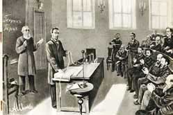 «Уважаемый преподаватель А. С. Попов… комбинировал особый переносной прибор, отвечающий на электрические колебания обыкновенным электрическим звонком, и чувствительный к герцевским волнам на открытом воздухе на расстояниях до 30 сажен… Об этих опытах А. С. Поповым в прошлый вторник было доложено в Физическом отделении Русского физико-химического общества, что было встречено с большим интересом и сочувствием. Поводом ко всем этим опытам служит теоретическая возможность сигнализации на расстоянии без проводников, наподобие оптического телеграфа, но при помощи электрических лучей».