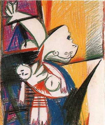 Справа "Мать с мертвым младенцем на лестнице" (этюд к "Гернике") (фрагмент, 1937, Мадрид, Прадо). Две фигуры этого рисунка приготовлены для левой части "Герники", над которой возвышается бык, также изображенный в момент смерти.