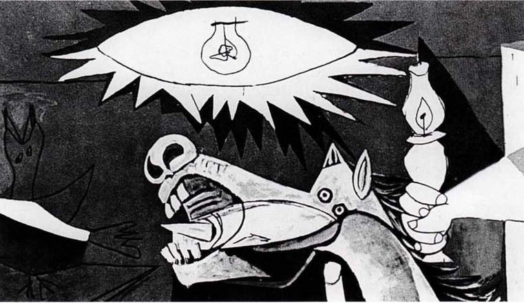 Фрагмент с головой агонизирующей лошади (см. рядом) повторяет сюжет, аналогичный изображенному в "Корриде", - смерть тореадора (1933). Эта деталь свидетельствует о том, что смерть животных стала у Пикассо символом человеческой трагедии в целом.
