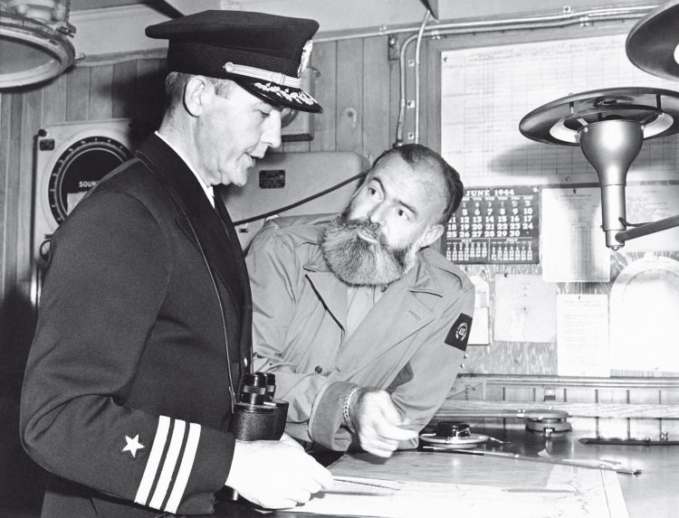 Эрнест Хемингуэй (справа) над картами вторжения с капитаном атакующего судна, 4 июля 1944 год.