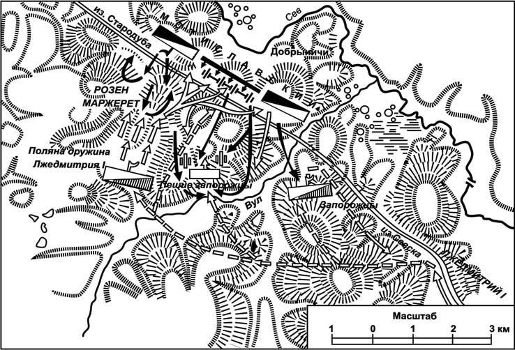 Тем временем войско Лжедмитрия уже добилось первых успехов: пограничный Моравский острог без боя отворил ему ворота. Этому примеру последовали другие города Северской земли – Чернигов и Путивль, жители которых присылали к «царевичу» закованных в цепи царских воевод. «Дмитрий Иванович» демонстрировал милость: пленных освобождали, прощая им службу узурпатору «по неведению». Полной противоположностью действиям самозванца были действия отправленных в Северскую землю царских войск, жестоко и без особого разбора расправлявшихся с населением уездов, перешедших на сторону Лжедмитрия. И этим царь Борис еще больше отвращал от себя собственных подданных. К войску претендента на московский престол присоединились запорожские и донские казаки, за счет чего силы самозванца возросли до 15 тысяч человек. Однако взять Новгород-Северский, одну из ключевых крепостей региона, ему не удалось. Город мужественно оборонял окольничий воевода Пётр Фёдорович Басманов (брат которого годом ранее пал в бою с восставшими холопами атамана Хлопко). На выручку Новгороду-Северскому к середине декабря подоспела 40-тысячная царская рать под командой боярина Фёдора Ивановича Мстиславского (которому в случае победы была обещана рука царевны Ксении). Вероятно, царь Борис был в тот момент на краю отчаяния, если собирался выдать столь горячо любимую дочь за своего сверстника, человека, перешагнувшего пятидесятилетний рубеж. Сражение у стен Новгорода-Северского, развернувшееся 21 декабря 1604 г., тем не менее успеха царской рати не принесло: воеводу князя Мстиславского ранили, а его войско вынуждено было отступить.