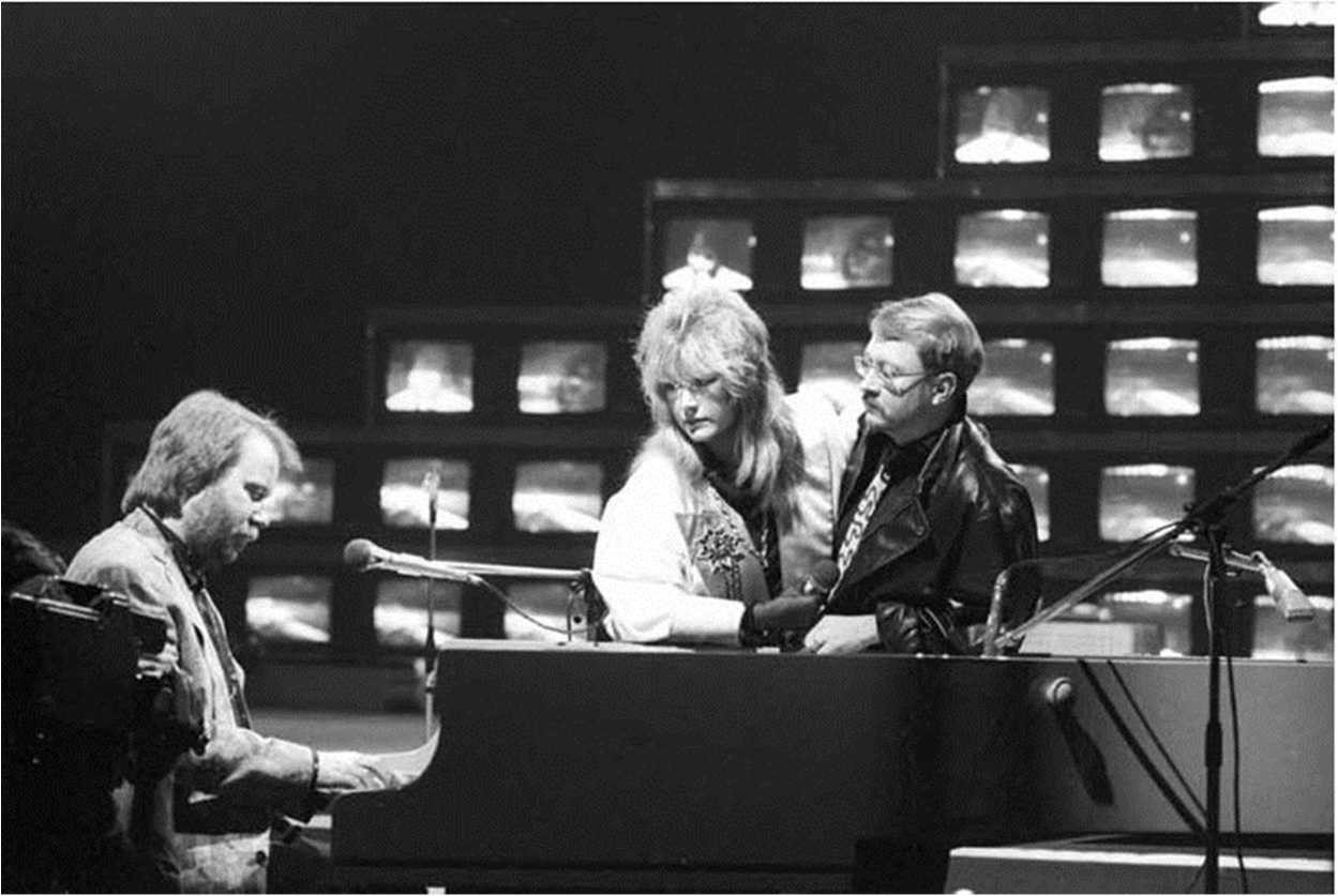 Бенни Андерсон («АББА»), Алла Пугачёва и Якоб Далин, ведущий шведской телепрограммы «Лестница Якоба»,1987