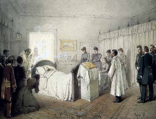 Заупокойная служба по умершему Александру III в комнате Ливадийского дворца 21 октября 1894 года. Художник М. Зичи.