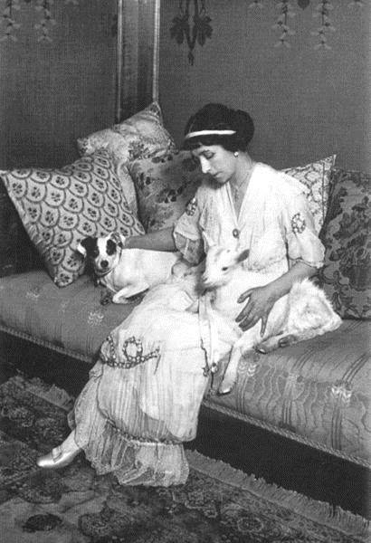 Матильда Кшесинская (1872–1971) в одной из комнат своего особняка на Кронверкском проспекте с фоксом Джиби и козочкой, принимавших участие в балете «Эмеральда», Санкт-Петербург. 1913 г.