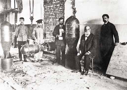 Н. Е. Жуковский и его ученики в лаборатории МВТУ на испытании авиационных бомб. 1915 г. (слева направо: 2-й – Мусинянц, 3-й – Ветчинкин, 4-й – Н. Е. Жуковский).