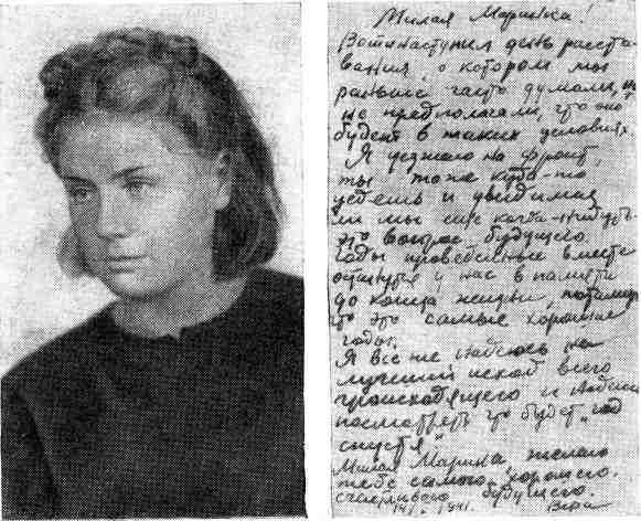 «Милые Маринка и Валюша, — писала Вера. — Завтра у нас начинается новая жизнь. Вы долго не будете получать наших писем. Не сердитесь. Как только будет можно найти время, будем стараться писать. С Ниной мы будем не вместе, ну да так лучше. Когда встретимся, будет больше интересного… Вы, наверное, все же беспокоитесь о нас. Сильно не надо. Мы очень крепко вооружены. Если вы сейчас вооружены лопатой, то мы с Нинкой наганом, гранатой и еще кое-какими вещами. Нам выдали все обмундирование. Так что из нас получились бравые ребята.