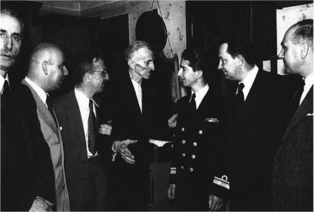 Накануне юбилейных торжеств. Слева направо: У. Лоренс, Дж. О’Нил, К. Свизи, Н. Тесла, У. Джонсон (сын Р. Джонсона), С. Казанович, племянник Теслы и пресс-атташе югославского посольства в Нью-Йорке, X. Гернсбек.