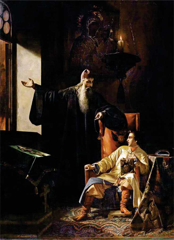 «Иван IV и протопоп Сильвестр во время большого московского пожара 24 июня 1547 года». Художник П. Плешанов