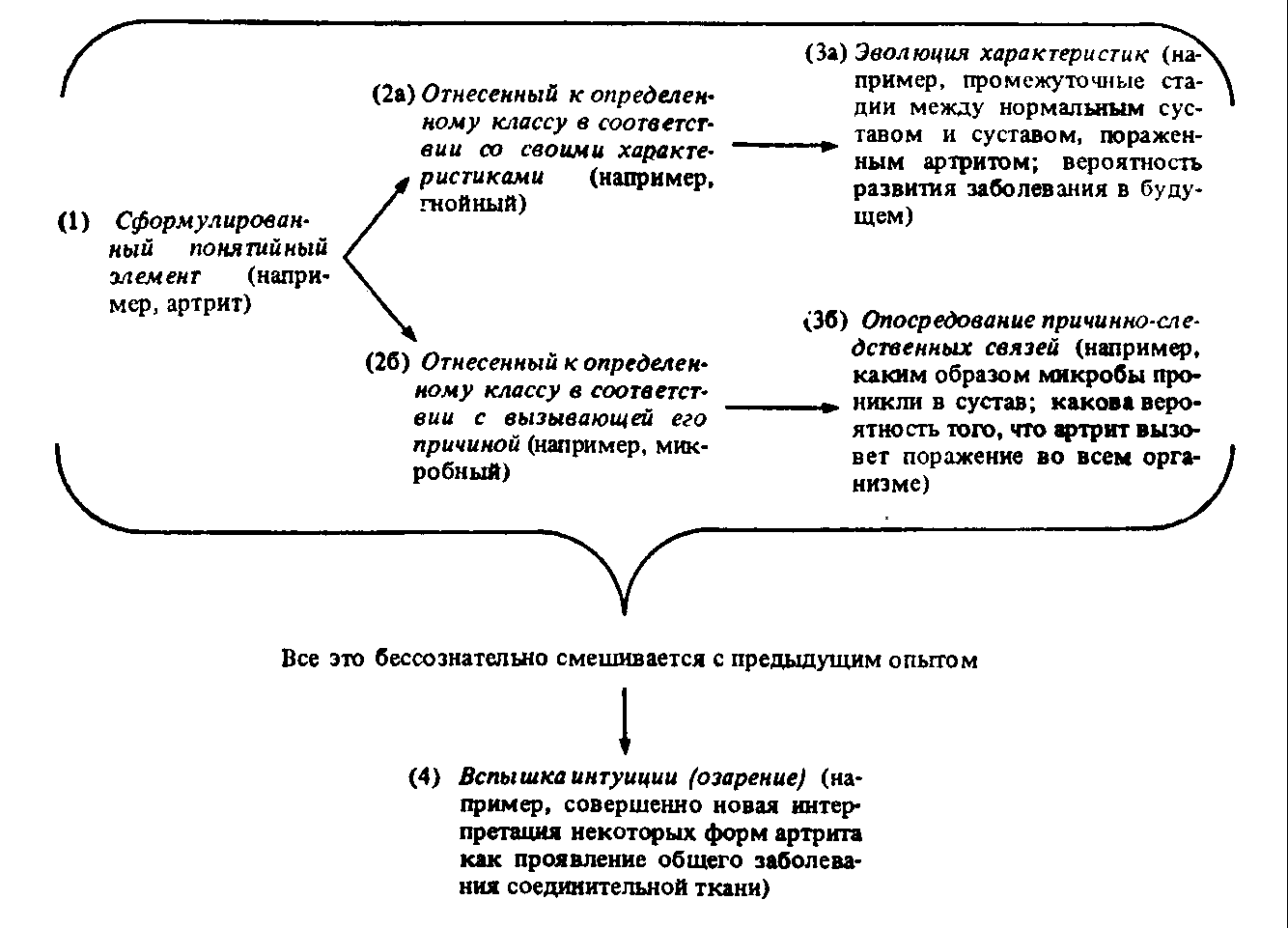 (4) Вспышка интуиции (озарение) (например, совершенно новая интерпретация некоторых форм артрита как проявление общего заболевания соединительной ткани).