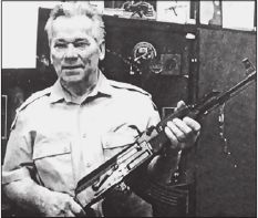 Михаил Тимофеевич Калашников родился в ноябре 1919 г. в селе Курья на Алтае. До призыва в армию в 1938 г. он работал в паровозном депо на станции Матай. Служить Калашникову довелось в танковых войсках, сначала механиком-водителем, а потом командиром танка. В начале октября 1941 г. под Брянском он был тяжело ранен и много времени провел на больничной койке. Именно тогда, раздобыв несколько случайных книг, Калашников сконструировал свой первый автомат. Рабочие из депо, где он трудился до войны, помогли сделать первый опытный образец. Калашников отправился в Самарканд, в эвакуированную из Москвы Артиллерийскую академию им. Дзержинского и попросил дать заключение на созданное им оружие. Профессор Благонравов, внимательно изучив конструкцию автомата, отправил его с рекомендательным письмом в Москву. На Московском научно-испытательном полигоне стрелкового и минометного оружия изделие Калашникова подвергли всесторонним испытаниям. Оценив достоинства автомата (малый вес, малая длина, наличие одиночного огня, удачное сочетание переводчика и предохранителя), комиссия отметила его сложность. Поэтому к промышленному производству автомат рекомендован не был. Неудача не обескуражила молодого конструктора. Он отправился в Ташкент и взялся за разработку ручного пулемета. В декабре 1943 г. был готов опытный образец. Однако и это создание Калашникова не было принято на вооружение. После повторной неудачи Калашников начал конструировать самозарядный карабин под новый патрон (7,62 мм) образца 1943 г. Его также отклонила военная комиссия. Но опыт, приобретенный в работе над этими образцами стрелкового оружия, очень пригодился ему в дальнейшем.