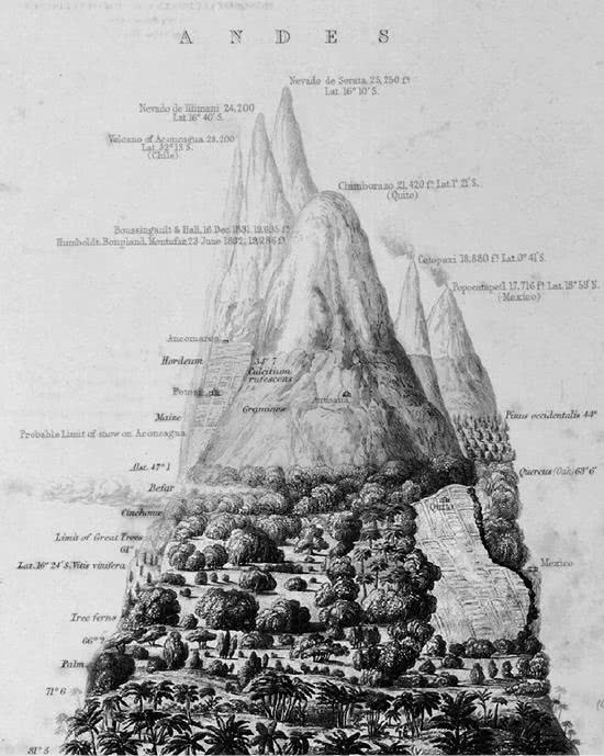 Стоя на вершине Чимборасо, Гумбольдт, утомленный восхождением, любовался видом. Здесь растительные пояса укладывались один к верхней границе другого. В этих долинах он проходил через пальмовые и влажные бамбуковые леса, где яркие орхидеи льнули к стволам. Поднявшись выше, он наблюдал хвойные деревья, дубы и кустарники, напоминающие барбарис, – все это было ему знакомо и схоже с растительностью европейских лесов. Потом пришла очередь альпийских лугов с растительностью, очень похожей на ту, которую он собирал в горах Швейцарии, и лишайников, которые напоминали ему экземпляры Заполярья и Лапландии. Никто еще не смотрел так на растения. Гумбольдт видел их не как узкие категории классификации, а как типичных представителей, соответствующих месту и климату обитания. Это был человек, который видел в природе масштабную силу, расположившую климатические зоны вдоль всех континентов, – глубокая для его времени концепция и одна из немногих до сих пор влияющая на наше понимание экосистем.
